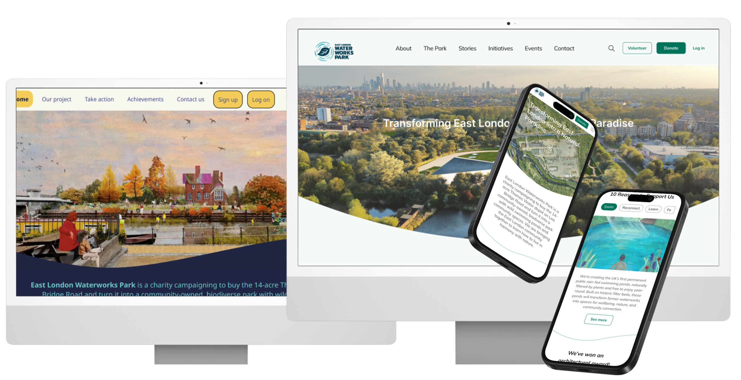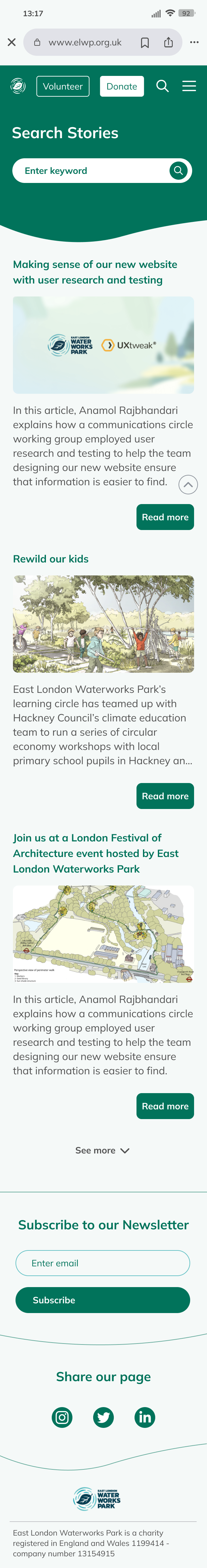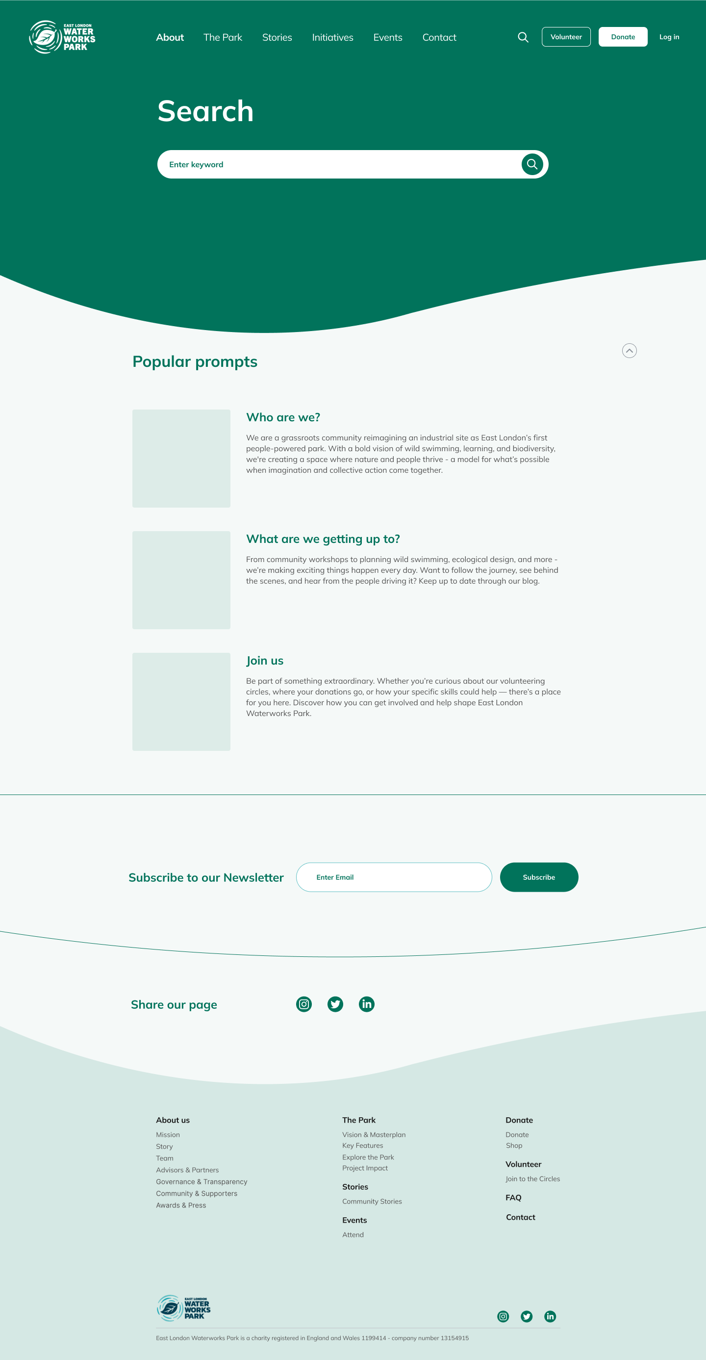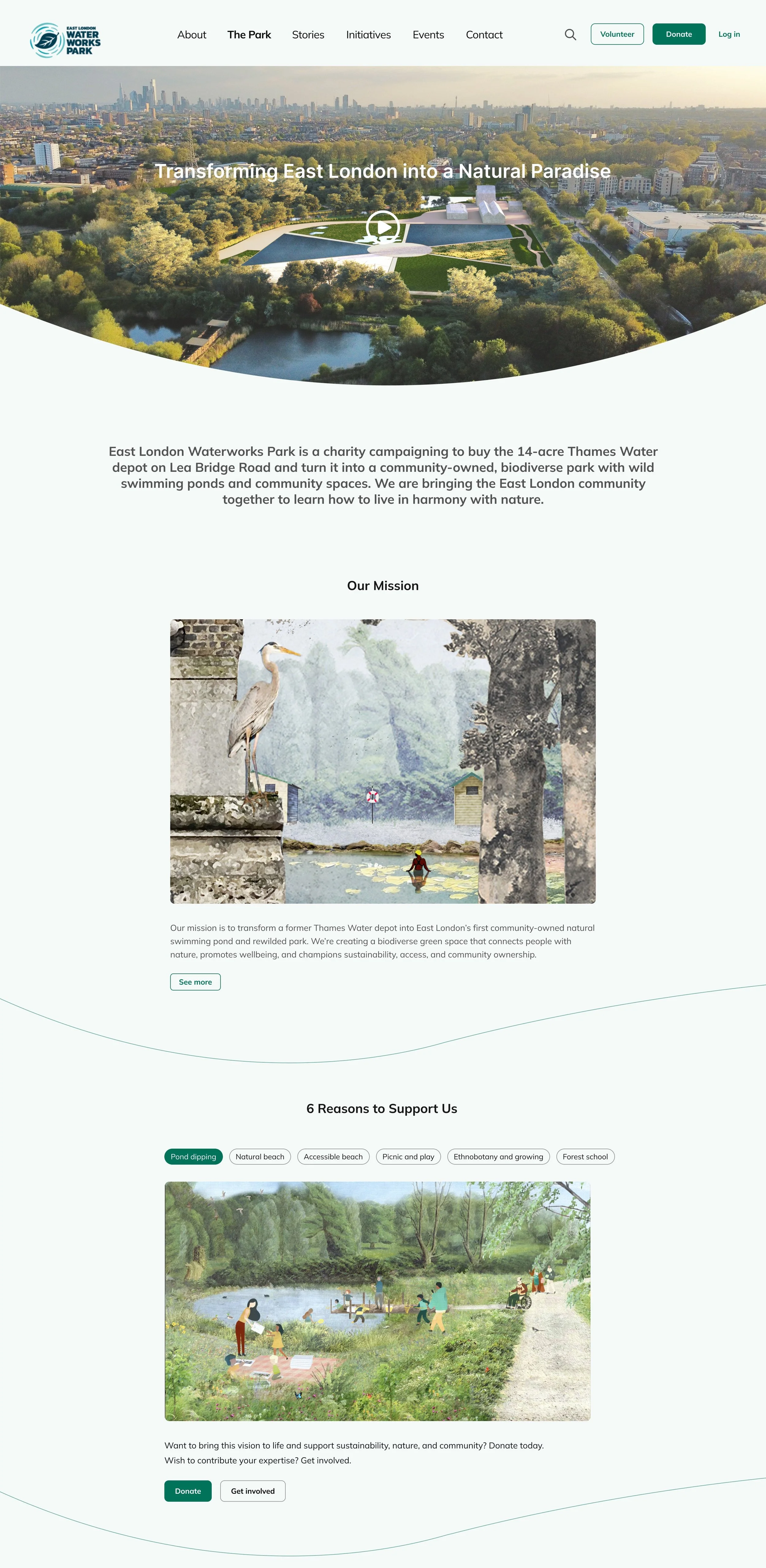 In response to feedback, we refined the colourway to create a calmer, more accessible aesthetic and introduced clearer visual hierarchy. Additional UI elements such as section dividers were added—subtly shaped like the River Lea itself—to reflect ELWP’s identity while improving content structure and navigation.